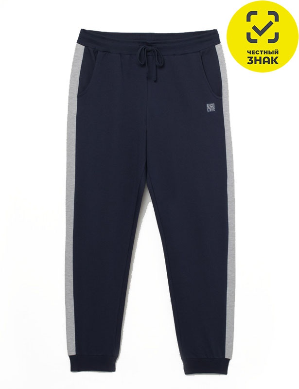Брюки на манжете, слегка зауженные к низу. Пояс отрезной из кашкорсе с эластаном, по поясу выполнена кулиска, кругловязаный шнур, с застроченными концами, вставлен в петли. Карманы наклонные. Манжеты из кашкорсе с эластаном. По боковым швам вставка из отделочного полотна. На левой полочке, ниже кармана, нашита жаккардовая декоративная этикетка.
