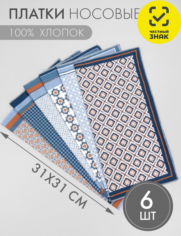 Платок носовой размером 31*31 см. Цена за упаковку, продажа по оптовым ценам осуществляется упаковками, 6 шт в упаковке.