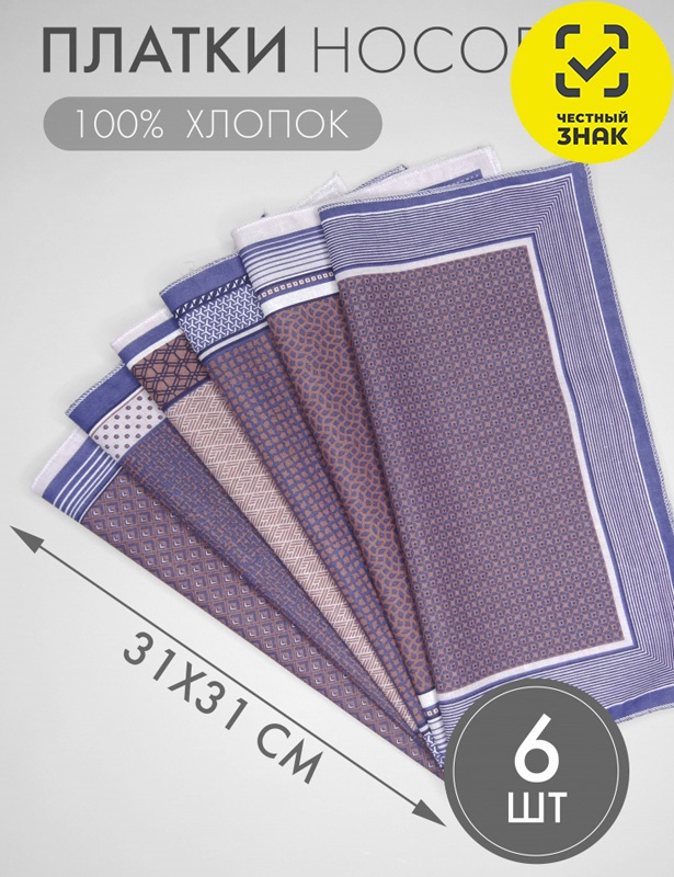 Платок носовой размером 31*31 см. Цена за упаковку, продажа по оптовым ценам осуществляется упаковками, 6 шт в упаковке.
