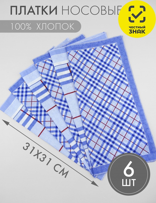 Платок носовой размером 31*31 см. Цена за упаковку, продажа по оптовым ценам осуществляется упаковками, 6 шт в упаковке.