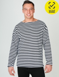 Мужская тельняшка (джемпер) из набивного полотна. Прямой силуэт, длинные рукава со спущенной линией плеча, округлая горловина.
