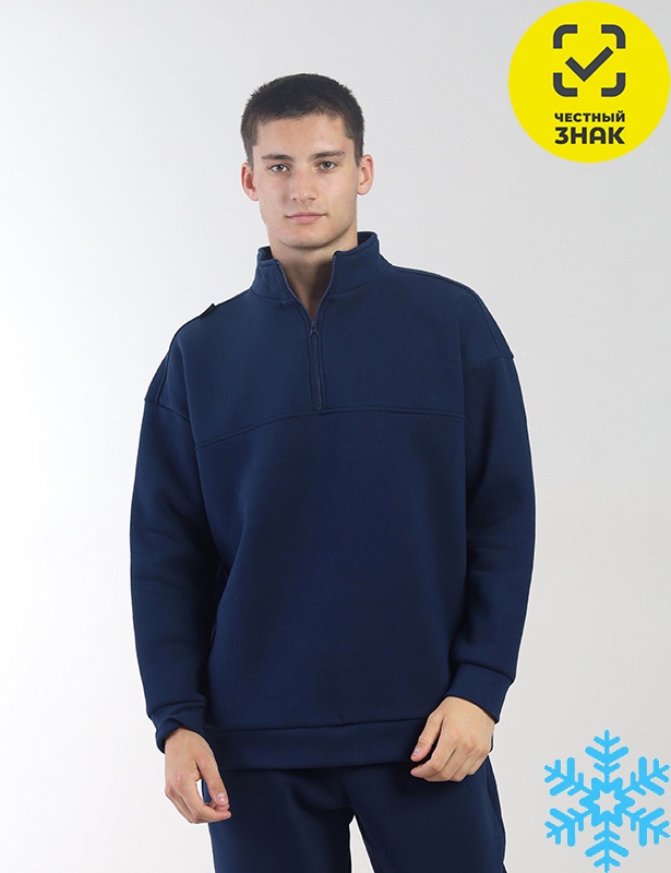 Толстовка с воротником-стойкой на "молнии". Плечевые швы переведены на полочку и отстрочены. Манжеты и пояс выполнены из рибаны с лайкрой. Декорирована текстильной этикеткой "флажок".