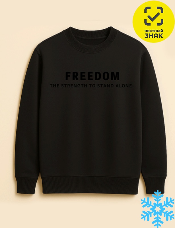Мужской свитшот. Надпись FREEDOM и слоган “The strength to stand alone.” подчёркивают силу характера и индивидуальность. Модель выполнена из мягкого трикотажа с начёсом, имеет круглый вырез, эластичные манжеты и низ, обеспечивая комфорт и стиль на каждый день.
