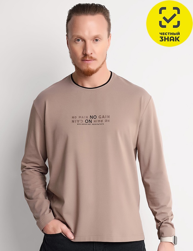 Мужской лонгслив прямого кроя с длинным рукавом и округлым вырезом с имитацией двойной горловины. Дополнен принтом на груди. Универсальная модель для повседневного стиля.