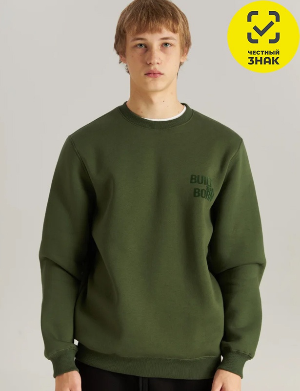 Мужская толстовка с минималистичным принтом BUILT BORN на груди. Классический прямой крой, круглый вырез и эластичные манжеты обеспечивают комфорт и универсальность для повседневной носки.