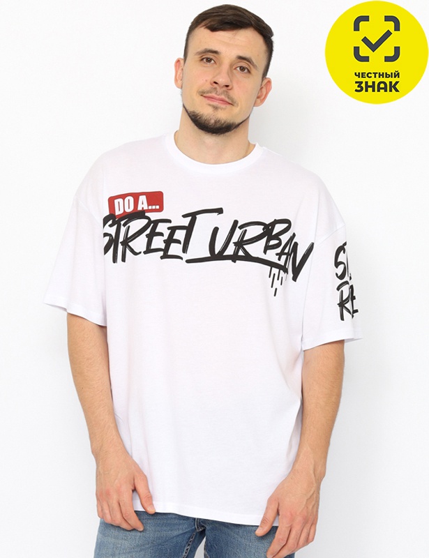 Футболка оверсайз длиной по линию бедер. Рукав до локтя. Круглая горловина обработана узкой притачной обтачкой из рибаны с эластаном. Полочка декорирована принтом "правила уличного городского стиля".