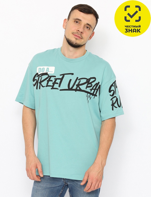 Футболка оверсайз длиной по линию бедер. Рукав до локтя. Круглая горловина обработана узкой притачной обтачкой из рибаны с эластаном. Полочка декорирована принтом "правила уличного городского стиля".