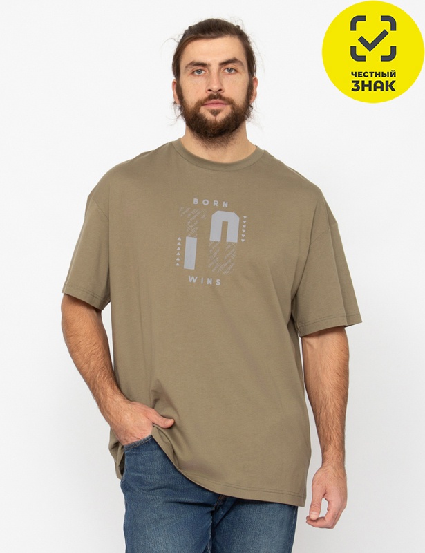 Футболка оверсайз длиной по линию бедер. Рукав до локтя. Круглая горловина обработана узкой притачной обтачкой из рибаны с эластаном. Полочка декорирована принтом.