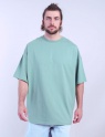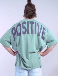 Футболка оверсайз из кулирки повышенной плотности длиной до бедер. Рукав до локтя. Круглая горловина обработана узкой притачной обтачкой из рибаны с эластаном. Спинка декорирована принтом "позитив".