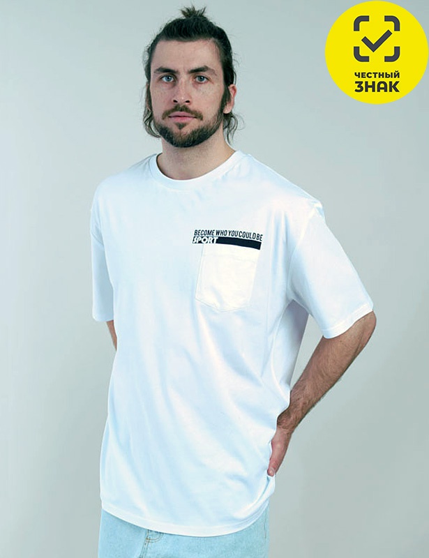 Футболка прямого силуэта длиной по линию бедер. Короткий рукав. Круглая горловина обработана узкой притачной обтачкой из рибаны с эластаном. Нагрудный карман декорирован принтом "стань тем, кем ты мог бы быть. спорт".