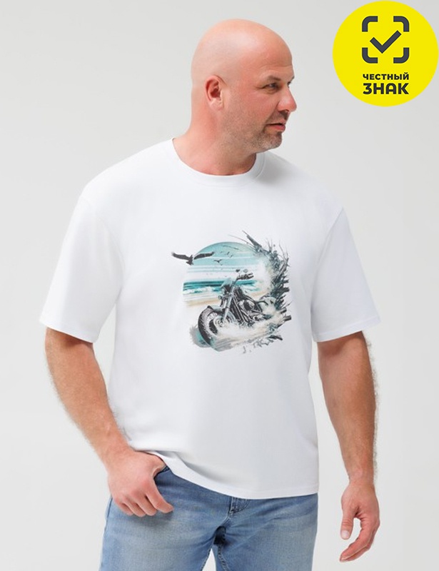 Футболка мужская из кулирного полотна, короткий втачной рукав и округлая горловина. Полочка декорирована печатью.