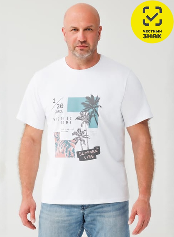Футболка мужская из кулирного полотна, короткий втачной рукав и округлая горловина. Полочка декорирована печатью.