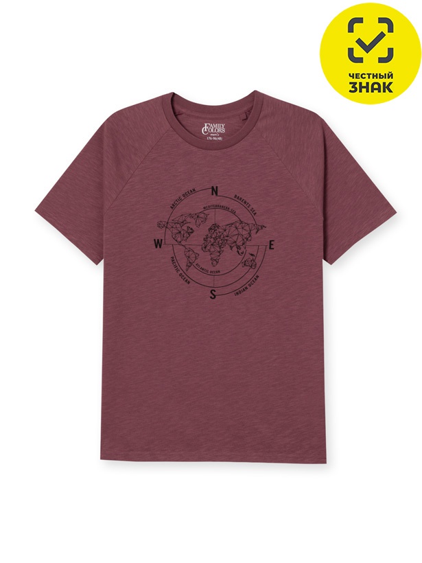 Футболка из полотна ФЛАМ ЭФФЕКТ (неравномерная пряжа) среднего объема с коротким рукавом реглан. На полочке принт "КАРТА ОКЕАНОВ" По горловине притачная обтачка из рибаны с эластаном. Шов по горловине спинки закрыт экстрафорной лентой.