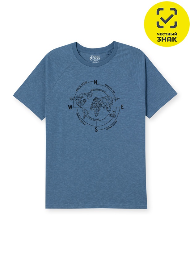 Футболка из полотна ФЛАМ ЭФФЕКТ (неравномерная пряжа) среднего объема с коротким рукавом реглан. На полочке принт "КАРТА ОКЕАНОВ" По горловине притачная обтачка из рибаны с эластаном. Шов по горловине спинки закрыт экстрафорной лентой.