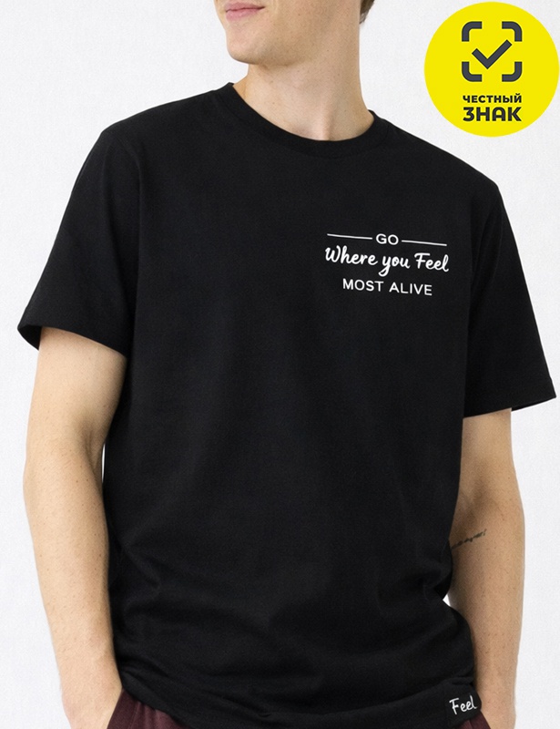 Футболка классического объема с коротким рукавом. Горловина обработана притачной обтачкой из рибаны с эластаном. На полочке с левой стороны небольшой принт "ИДИ ТУДА, ГДЕ ЧУВСТВУЕШЬ СЕБЯ НАИБОЛЕЕ ЖИВЫМ", внизу нашивная декоартивная этикетка-клипса "ПОЧУВСТВУЙ СЕБЯ ЖИВЫМ" . Шов по горловине спинки закрыт экстрафорной лентой.