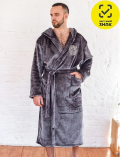 Халат мужской запашной с капюшоном из гладкокрашеного полотна экстрасофт, с длинными втачными рукавами на манжете и накладными боковыми карманами. На спинке и левой полочке тематическая вышивка.