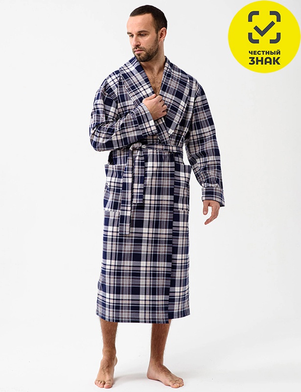 Халат мужской запашной с длинным рукавом, с отложным воротником "шалькой", с накладными карманами, с поясом.
