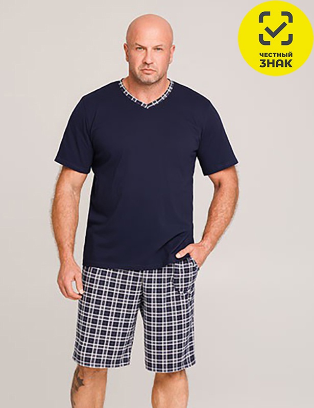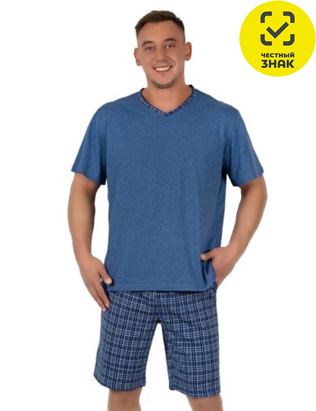 Пижама мужская состоит из двух предметов. Футболка с коротким рукавом, V-образной горловиной, с обтачкой по горловине в цвет шорт. Шорты удлиненные из набивного полотна, на поясе на резинке.