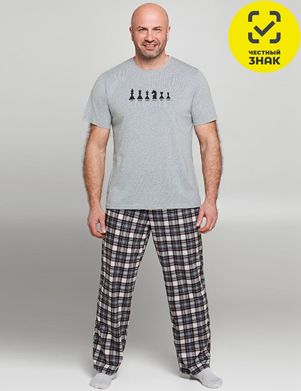 Пижама мужская состоит из 2-х предметов. Футболка с коротким втачным рукавом, округлый вырез горловины, на полочке печать. Брюки прямые из набивного полотна с рисунком "в клетку", на поясе на резинке.