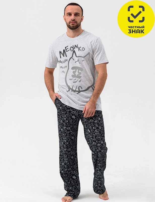 Производитель: ТМ Оптима Трикотаж Артикул: 2167-К Пижама мужская "Чёрный кот" (серый) Пол: МУЖСКОЙ Полотно: кулирная гладь Состав: 60% хб, 40% пэ Возраст: взросл