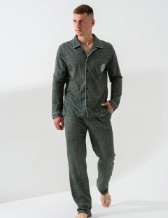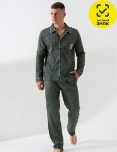 Пижама мужская состоит из пижамной куртки и брюк. Куртка с отложным воротником, с застежкой на петли и пуговицы. На левой полочке накладной нагрудный кармашек с вышивкой. Рукав длинный втачной на манжете. По линии борта, отлету верхнего воротника и манжету рукава проложен отделочный кант. Низ изделия обработан швом «вподгибку». Брюки прямого силуэта с боковыми карманами, цельнокроеным поясом на резинке.