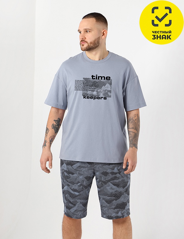 Костюм мужской из трикотажного полотна "кулирка" в комбинации двух видов , состоящий из футболки и шорт. Футболка - из гладкокрашеного полотна, свободного покроя, со спущенным плечом, короткими втачными рукавами, горловиной овальной формы, обработанной втачной планкой, и принтом в центре переда. По шву втачивания планки настрочена двойная отделочная строчка. Шорты - из полотна с набивным рисунком, удлиненные, на притачном поясе с эластичной тесьмой внутри, с карманами в боковых швах. Входы в карманы окантованы основным материалом.
