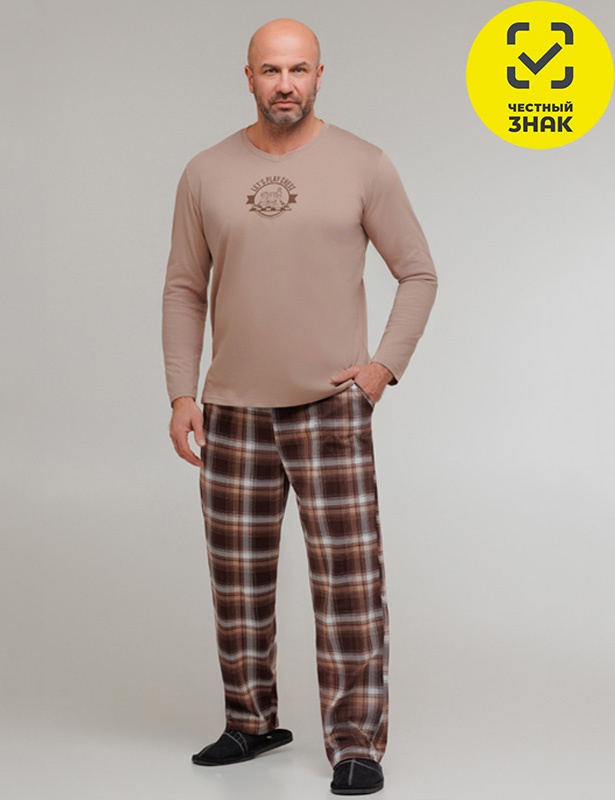 Комплект мужской состоит из 2-х предметов. Джемпер с длинными втачными рукавами, округлой горловиной, печать спереди. Брюки прямые, на поясе на резинке, карманы по бокам.