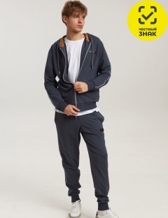 Мужской спортивный костюм из мягкого трикотажа. Капюшон с контрастной цветной вставкой из ткани с графичным принтом и застёжкой на молнию. Толстовка и брюки дополнены фактурными серыми вставками, придающими образу динамичности. На груди — нашивка с логотипом "Bumbacel". Брюки на резинке с функциональным шнурком и карманами.