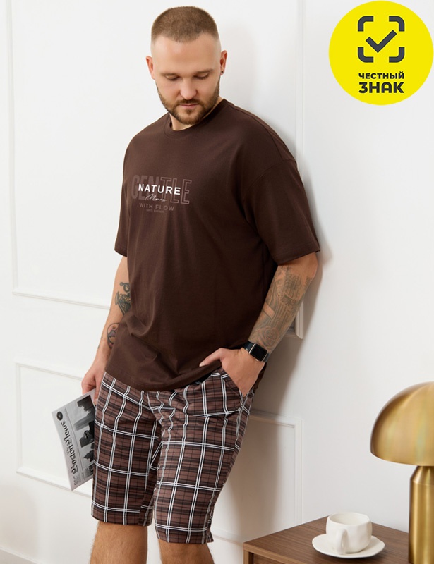 Костю мужской из трикотажного полотна "кулирка", состоящий из футболки и шорт. Футболка классического покроя, с короткими втачными рукавами и приспущенной линией плеч, горловиной овальной формы, обработанной втачной планкой и принтом на детали переда, выполненным в технике шелкографии. Нижние срезы рукавов и изделия обработаны подгибкой. По горловине настрочена отделочная строчка. Шорты длиной до колен, на притачном поясе с эластичной тесьмой внутри, с карманами в боковых швах. Нижние срезы обработаны подгибкой.