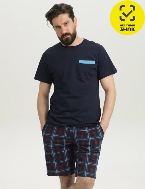 Мужской домашний комплект: однотонная футболка с нагрудным карманом и шорты в клетку. Удобный крой и мягкий материал обеспечивают комфорт для сна и отдыха.