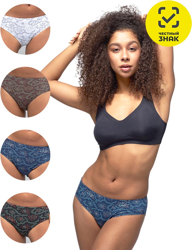 Трусы женские классического кроя из набивного полотна, на эластичном поясе, срезы обработаны невидимым швом. Трусы упакованы в картонную бирку-хедер, без коробки.