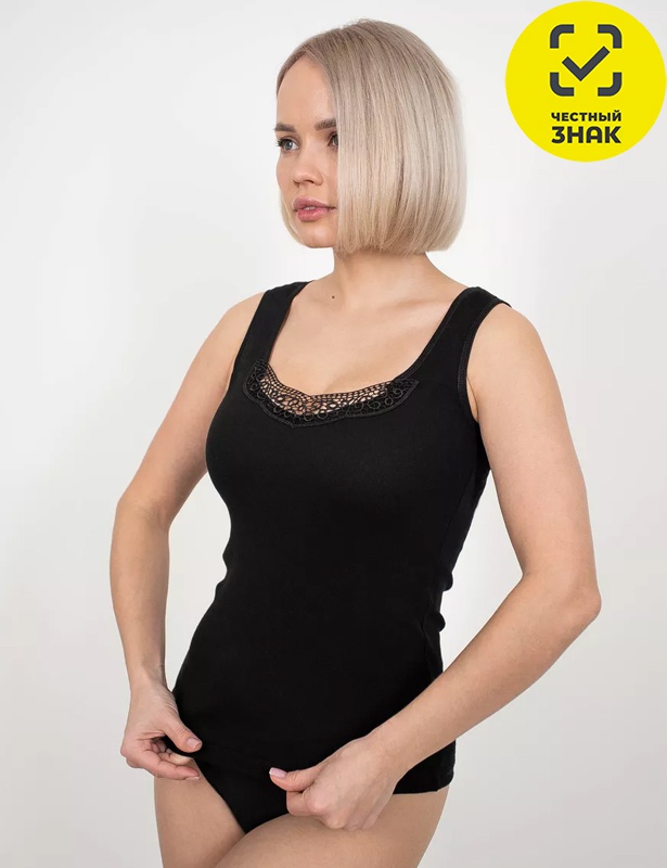 Производитель: Чебоксарский трикотаж Артикул: 1752 Майка женская (чёрный) Пол: ЖЕНСКИЙ Полотно: рибана Состав: хлопок 100% Возраст: взросл