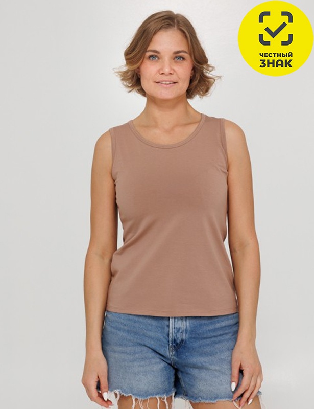 Майка женская с широким плечом, горловина и проймы окантованы бейкой в цвет полотна.