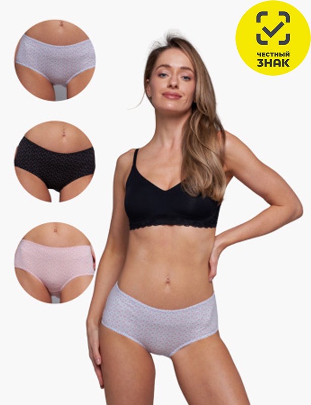 Трусы-шорты женские из набивного полотна, срезы обработаны мягким кружевом. Трусы упакованы в картонную бирку-хедер, без коробки.
