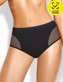 Трусы макси для женщин изготовлены из эластичного хлопкового полотна. Края обработаны жаккардовой резинкой по линии талии и полуокантовкой по нижней части. В передней части предусмотрены боковые вставки из сетки, а швы застилом.