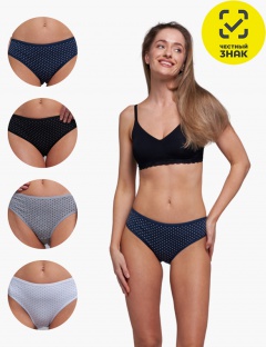 Трусы женские классического кроя из набивного полотна, срезы обработаны эластичной резинкой. Трусы упакованы в картонную бирку-хедер, без коробки.
