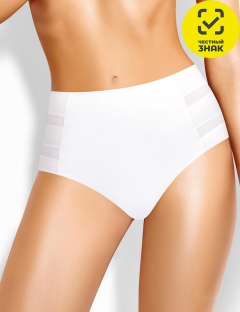 Трусы слипы с завышенной посадкой, сзади и сбоку бесшовная гладкая обработка, спереди декоративные горизонтальные вставки из плотной сетки, перед дублирован сеткой, по талии обработка с зигзагом и узкой резинкой.