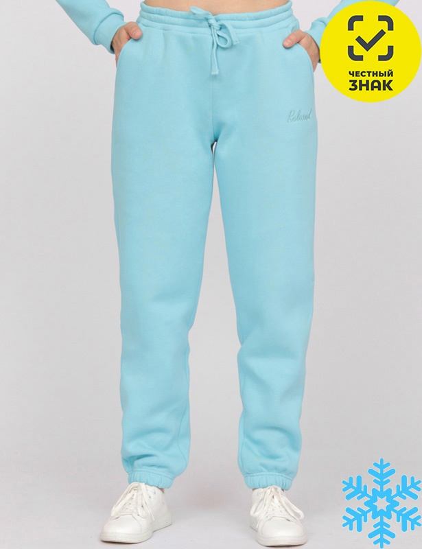 Брюки из футера трехнитки с начесом, на широкой резинке по ножкам. Отрезной пояс выполнен из основного полотна. В поясе обработана кулиска, кругловязаный шнур, с застроченными концами, вставлен в петли. Карманы наклонные с отстрочкой по входу в карман. Ниже кармана с правой стороны деликатная вышивка.