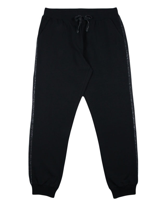 Брюки на манжете. Притачной пояс из кашкорсе с эластаном, по шву притачивания отстрочка. По поясу выполнена кулиска, в нее вставлена тесьма из экстрафорной ленты с люрексом, с застроченными концами. Карман наклонный, с отстрочкой. По боковому шву настрочен лампас из экстрафорной ленты с люрексом. По низу ножек манжеты из кашкорсе с эластаном.