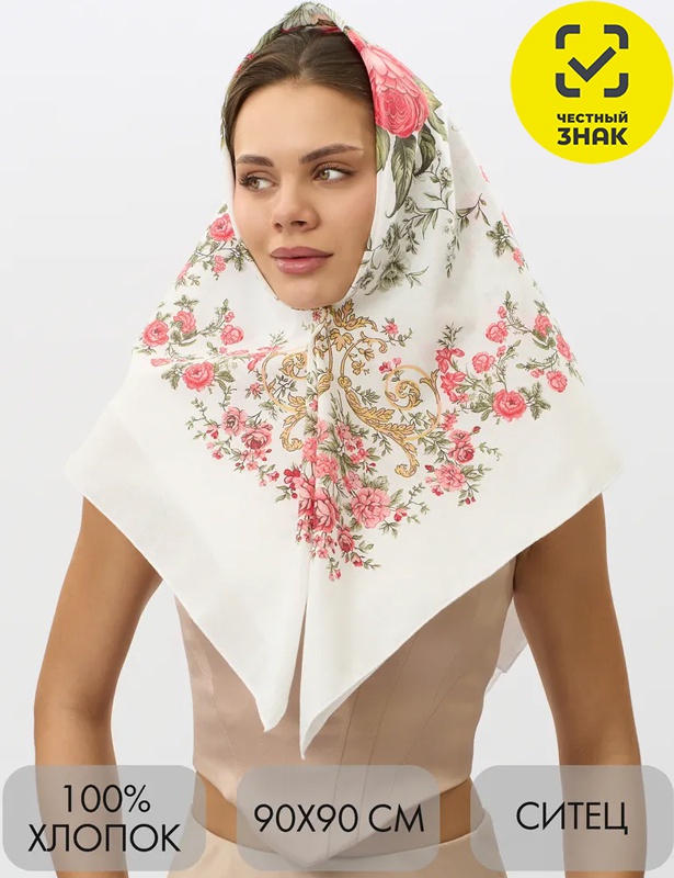 Производитель: ТМ Шалун Артикул: А643 Платок головной (белый/цветы) Пол: ЖЕНСКИЙ Полотно: ситец Состав: хлопок 100% Возраст: взросл