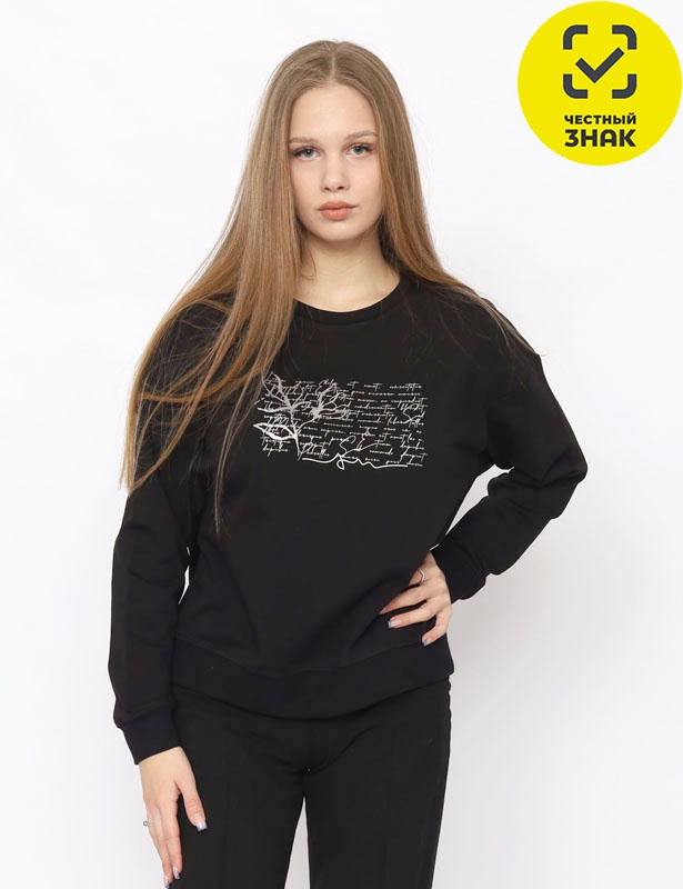 Джемпер женский прямого силуэта, длинные рукава на манжетах, со спущенным плечом. Круглая горловина обработана узкой притачной обтачкой из рибаны с эластаном. Полочка декорирована принтом с использованием красок с блеском.