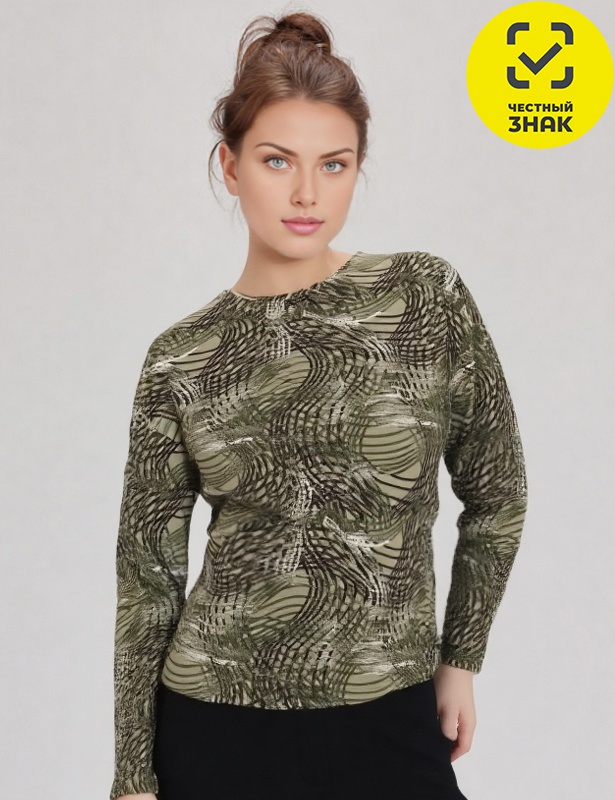 Джемпер женский из мягкой набивной вискозы, с длинными рукавами со спущенной линией плеча и округлой горловиной.