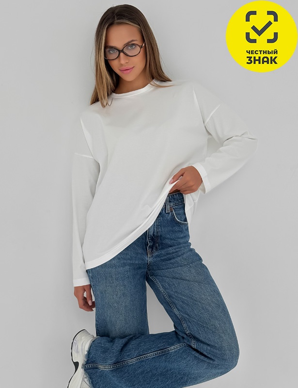 Женский лонгслив, имеет свободный крой оверсайз, длинный рукав со спущенным плечом и округлый вырез горловины.