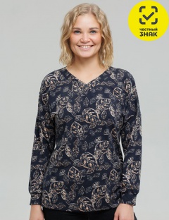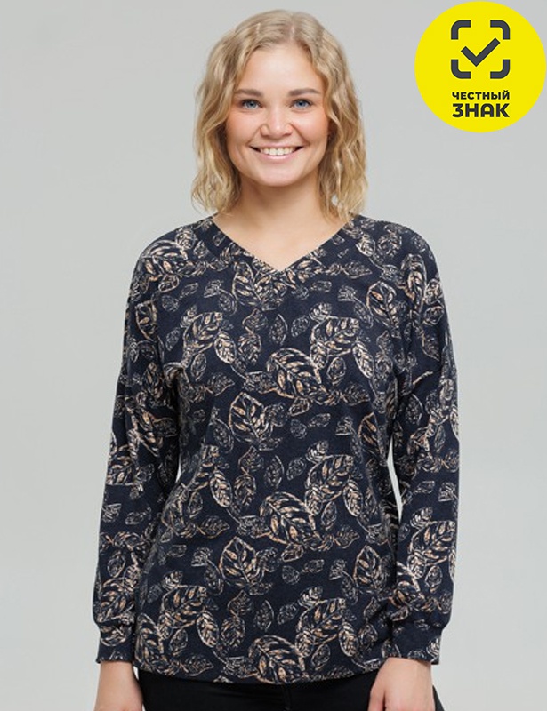 Джемпер из мягкой теплой вискозы и набивного полотна, с длинными втачными рукавами с манжетами, V-образный вырез горловины, свободный крой.