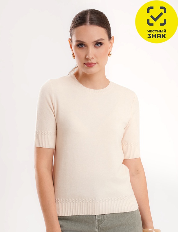 Вязаный джемпер укороченный из вискозной пряжи с добавлением нейлона, переплетения гладь. Втачной короткий рукав. Округлая горловина, по горловине бейка. По низу изделия и рукавов манжеты,в качестве декоративного элемента над манжетами вывязаны косы.