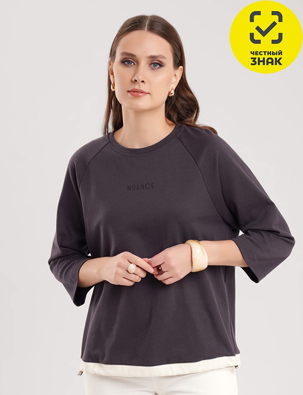 Джемпер свободного кроя из эластичного хлопкового полотна. Рукав реглан длиной 7/8. Округлая горловина с обтачкой. По низу изделия притачная контрастная кулиса с внутренним шляпным шнуром и стопором. Спереди принт.