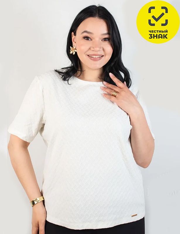 Джемпер женский из высококачественного хлопкового трикотажа с добавлением эластана. Рисунчатое плетение полотна, придает изделию легкий рельеф и объем. Данная структура ткани визуально добавляет легкости и утонченности образу. Свободный фасон с прямыми линиями подходит для любого типа фигуры, скрывает недостатки и подчеркивает женственность. Короткий рукав, оптимален для теплого времени года.