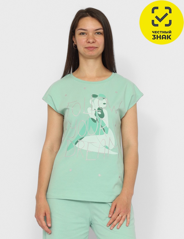 Футболка женская из кулирной глади. С цельнокройным рукавом. Воротник из эластичной рибаны. На полочке декоративный принт с серебром (следуй за своей мечтой).