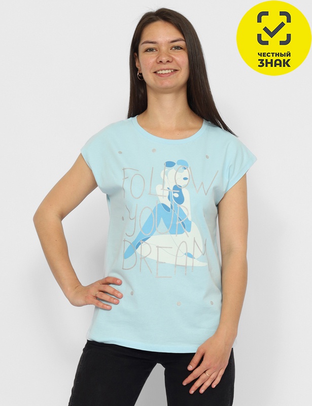 Футболка женская из кулирной глади. С цельнокройным рукавом. Воротник из эластичной рибаны. На полочке декоративный принт с серебром (следуй за своей мечтой).
