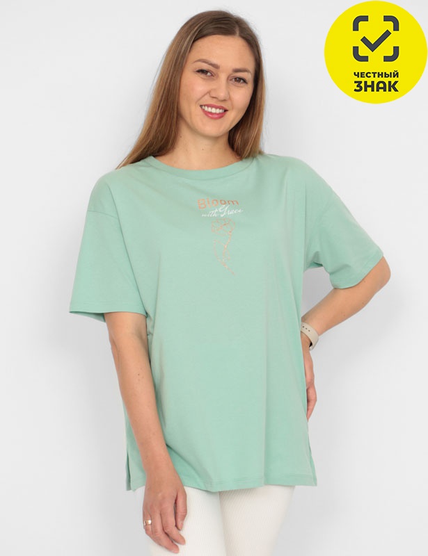 Футболка женская оверсайз из кулирной глади. С рукавом до локтя. Воротник из эластичной рибаны. На полочке декоративный принт (расцветайте с изяществом). Разрезы по бокам.